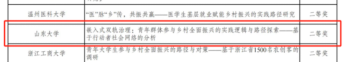 由邢占军、陈仁兴、褚雷老师指导的黄烁齐、薛鹏宇、王昱懿等同学组成的团队作品《嵌入式双轨治理:青年群体参与乡村全面振兴的实践逻辑与路径探索——基于行动者社会网络的分析》获二等奖。项目以“嵌入式双轨治理”为理论分析框架,在基于SNA量化分析相关政策中行动者协同结构的同时,通过三镇案例研究从多维视角探讨青年嵌入治理实践背后的内在机制,进而针对具体政府部门从四个方面提出了优化青年多维度参与路径的具体建议。