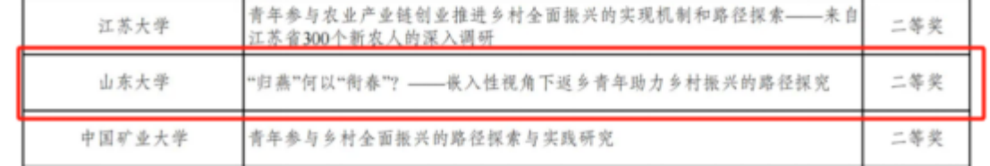 由褚雷、李进涛、张乐老师指导的杜雪艳、李健瑜、王凯华等同学组成的团队作品《“归燕”何以“衔春”?——嵌入性视角下返乡青年助力乡村振兴的路径探究》获二等奖。团队通过访谈L市七位典型返乡人才并实地调研其产业基地,明晰L市返乡人才“低结构性-高关系性”嵌入的样态并构建返乡人才嵌入乡村振兴的分析框架,揭示了情感嵌入、人际互动、政治支持及市场嵌入四大机制发挥的作用,在此基础上提出相关优化路径和对策建议,以期切实破解返乡青年嵌入的困境,推动乡村振兴。