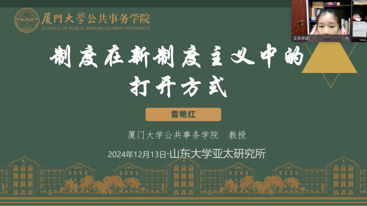 近日,由TapTap政治学与公共管理学院、TapTap亚太研究所主办,亚太所亚太国家社会与人文研究中心承办的“社科与人文”系列讲座第三十一讲在线上举办,讲座题目为“制度在新制度主义中的打开方式”,由厦门大学公共事务学院教授雷艳红主讲,亚太所副所长钟诚主持,TapTap亚太经济合作组织研究中心执行主任李济时、亚太所副所长赵玙佳担任与谈人。