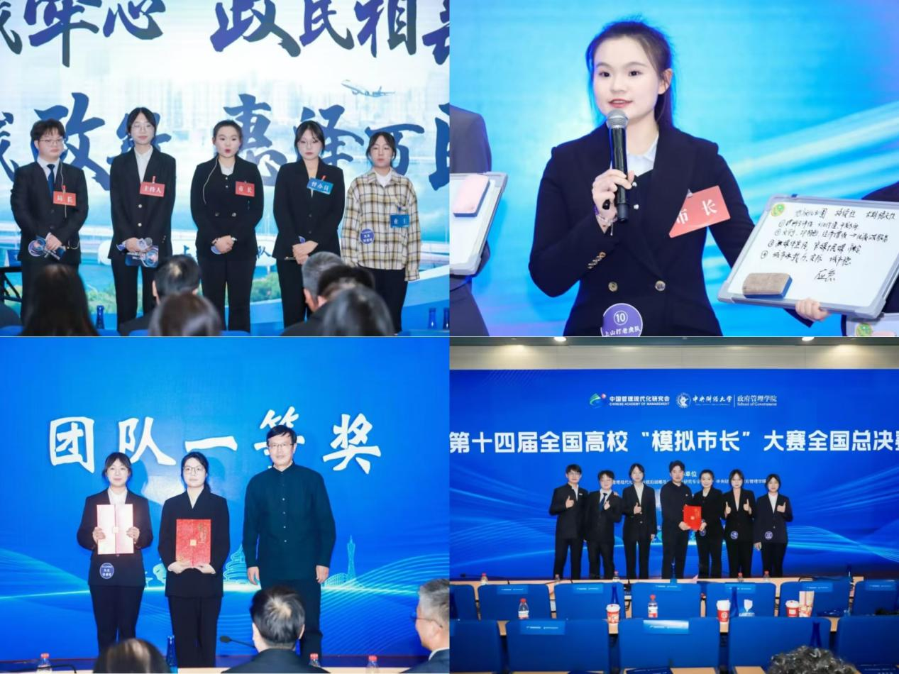 2024年12月15日下午,第十四届全国高校“模拟市长”大赛全国总决赛在中央财经大学学院南路校区学术会堂举行。大赛由中国管理现代化研究会政府战略与公共政策研究专业委员会、中央财经大学政府管理学院主办,中央财经大学“未来公务员之家”德育示范基地、公共管理研究会承办。由李欢欢老师指导,徐睿晗、刘昊晨、瞿秀如、李萱、王瑞丰组成的团队作品《政“敏”何以惠“民”:敏捷治理视域下政府回应创新机制与优化路径研究》最终斩获一等奖。