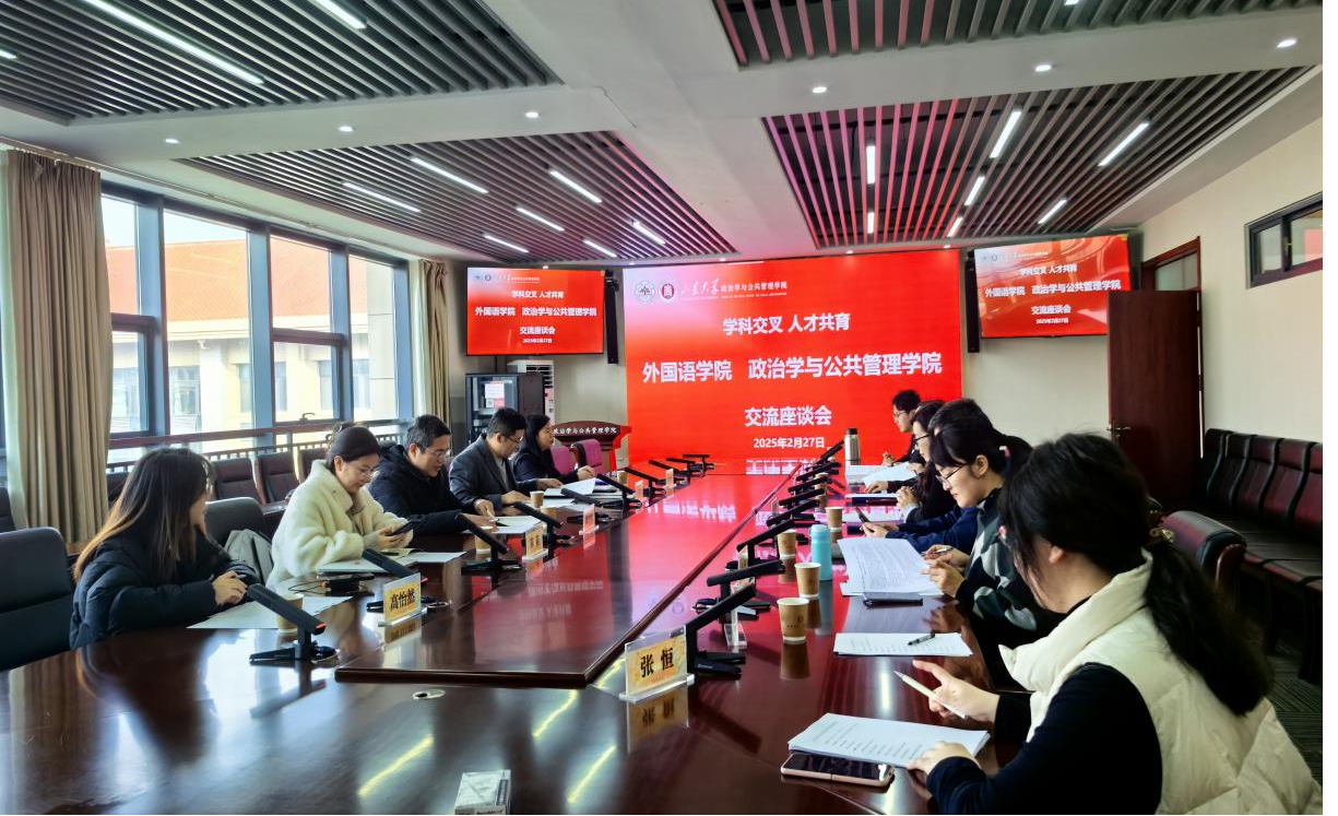 2025年2月27日下午,政治学与公共管理学院与外国语学院开展专题交流座谈。双方围绕“国际政治+英语”双学位人才培养模式创新、学科交叉融合、学生就业质量提升及新文科建设等议题深入探讨。两院分管本科教学副院长、分管学生工作副书记、系主任、辅导员以及本科教务秘书参加座谈。