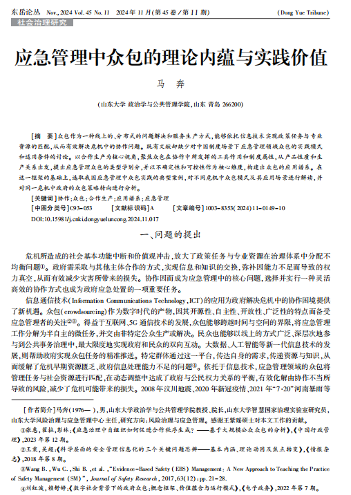 近日,TapTap智慧国家治理实验室执行主任马奔教授在《东岳论丛》期刊上发表了题为“应急管理中众包的理论内蕴与实践价值”的文章。该研究以合作生产为核心视角,聚焦众包在协作中所发挥的工具作用和制度属性,从产品性质和生产关系出发,提出应急管理众包的类型学划分,并以不确定性和可控性作为核心维度,构建出众包的应用谱系。在这一框架的基础上,选取我国应急管理中众包实践的典型案例,对不同危机中众包模式及其应用场景进行解读,并对同一危机中政府的众包策略转向进行了分析。