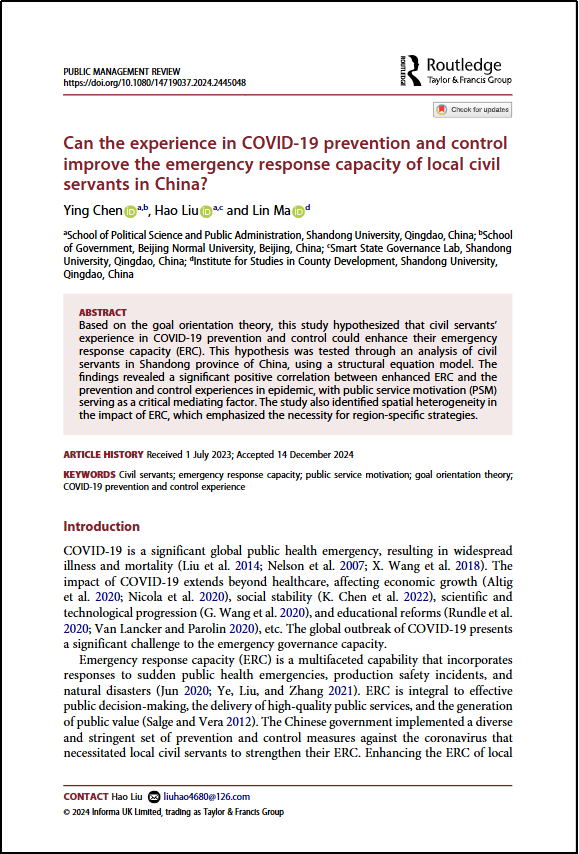 近日,政治学与公共管理学院刘浩副教授作为通讯作者的文章《Can the experience in COVID-19 prevention and control improve the emergency response capacity of local civil servants in China?》在公共管理学科顶尖期刊Public Management Review在线发表。Public Management Review期刊在管理学类别中位于一区(Q1),影响因子在公共行政和公共政策领域SSCI期刊中位列第三,是公共管理学科五大权威期刊之一。该文章是由刘浩副教授(通讯作者)及我院硕士研究生陈颖(第一作者)、马琳副教授合作完成。该科研成果得到国家社会科学基金(23BGL318,主持人刘浩)资助。