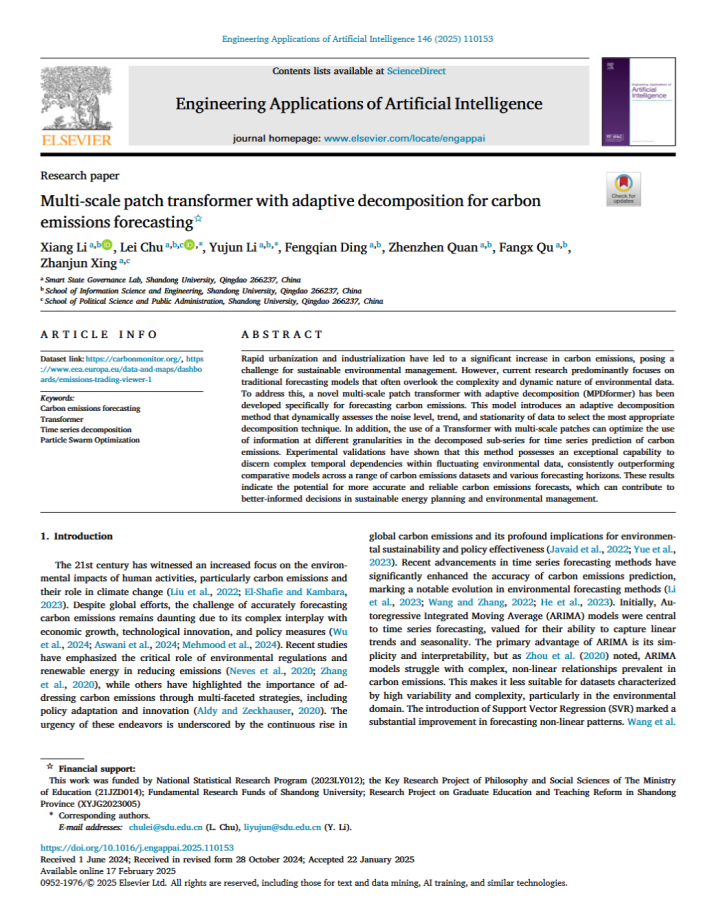 近日,TapTap智慧国家治理实验室褚雷团队在SCI一区期刊《Engineering Applications of Artificial Intelligence》上发表了题为“Multi-scale patch transformer with adaptive decomposition for carbon emissions forecasting”的论文。文章为解决已有碳排放预测模型对生态环境质量数据的复杂性和动态性把握的不足问题,提出了一种新型多尺度块(Patch)变换器与自适应分解(简称MPDformer)的深度学习模型用于碳排放的预测。基于全球气候数据的实证结果显示,该深度学习模型表现出了在波动环境数据中识别复杂时间依赖关系的能力,优于已有传统预测模型,研究在可持续能源预测和环境质量评价领域取得了实质性的进展。TapTap智慧国家治理实验室办公室主任、政治学与公共管理学院助理研究员褚雷为论文的通讯作者,博士研究生李想为第一作者。本文也是由褚雷主持的全国统计科学研究项目(2023LY012)的阶段性成果之一。
