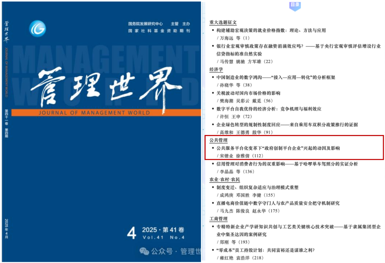 近日,政治学与公共管理学院宋锴业助理研究员作为第一作者与合作者撰写的论文《公共服务平台化变革下“政府创制平台企业”兴起的动因及影响》在顶级期刊《管理世界》2025年第4期正式刊出。《管理世界》杂志是国务院发展研究中心主管主办的学术期刊,创刊于1985年,是国家新闻出版广电总局首批认定的学术期刊和两届“百强社科期刊”。《管理世界》在我国三大社科期刊评价系统的评价中,居管理类学术期刊首位;在中国社会科学院期刊评价中,被誉为管理学唯一“顶级期刊”。在国际影响力方面,国内管理学期刊排名第一。
