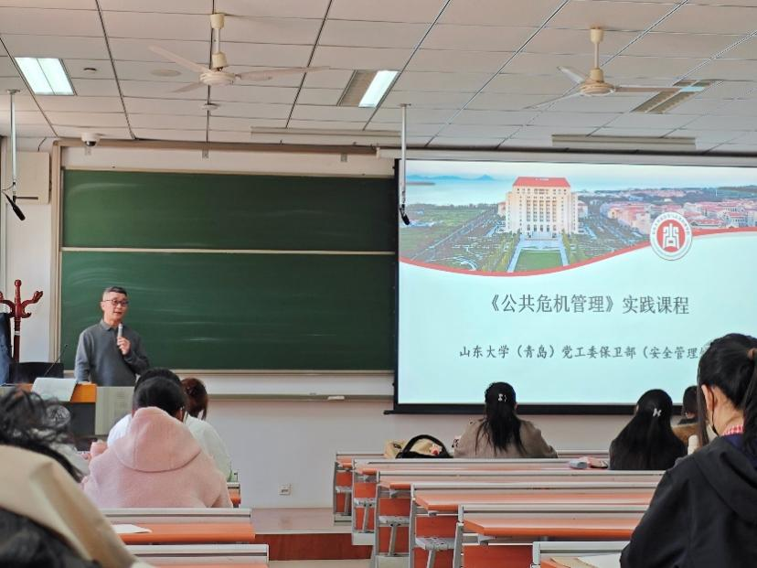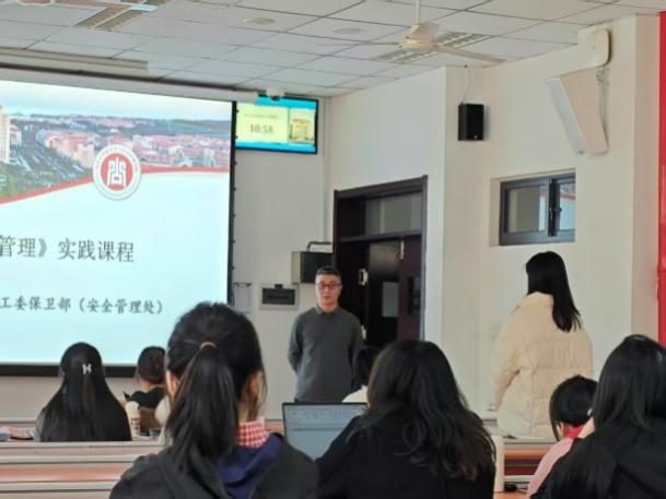 活动伊始,金鑫老师结合实际工作经验,为同学们讲解了青岛校区安委会的组织架构、突发事件应急处置预案以及保卫处的日常工作内容。他指出,青岛校区安委会在长期发展过程中,形成了“1+8+N”的特色工作机制,并根据实际情况对应急预案进行了不断修订,以确保校园的稳定与安全。金鑫老师的讲解为同学们提供了深入了解应急管理流程和策略的机会,让大家更加清晰地认识到应急管理在实际操作中的复杂性和重要性。