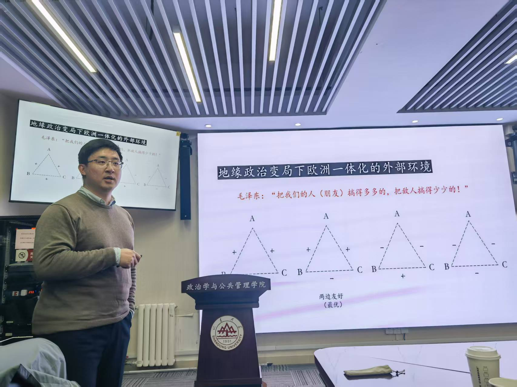 张亚宁老师在工作坊中分享了自己近期围绕欧洲一体化的研究心得,系统分析了欧洲一体化在地缘政治变局中面临的制度困境与未来的演化逻辑。张亚宁老师指出,在当前的地缘政治变局中,欧盟在经贸、产业竞争力、外交关系、安全防务与内部治理等多个维度均存在着不可忽视的风险。他引入战略三角理论考察中、美、欧三边关系的变化。此外,在后冷战时代形成的“重经济合作、轻权力政治、弃传统安全”的新自由主义理念作为欧盟制度设计的核心逻辑已经无法适应当前的国际变局。因此,欧盟未来需要重新调整“经济与安全”和“政治与市场”这两对重要关系,以激发制度活力、提升内部治理能力与效率,以危机倒逼一体化推进。