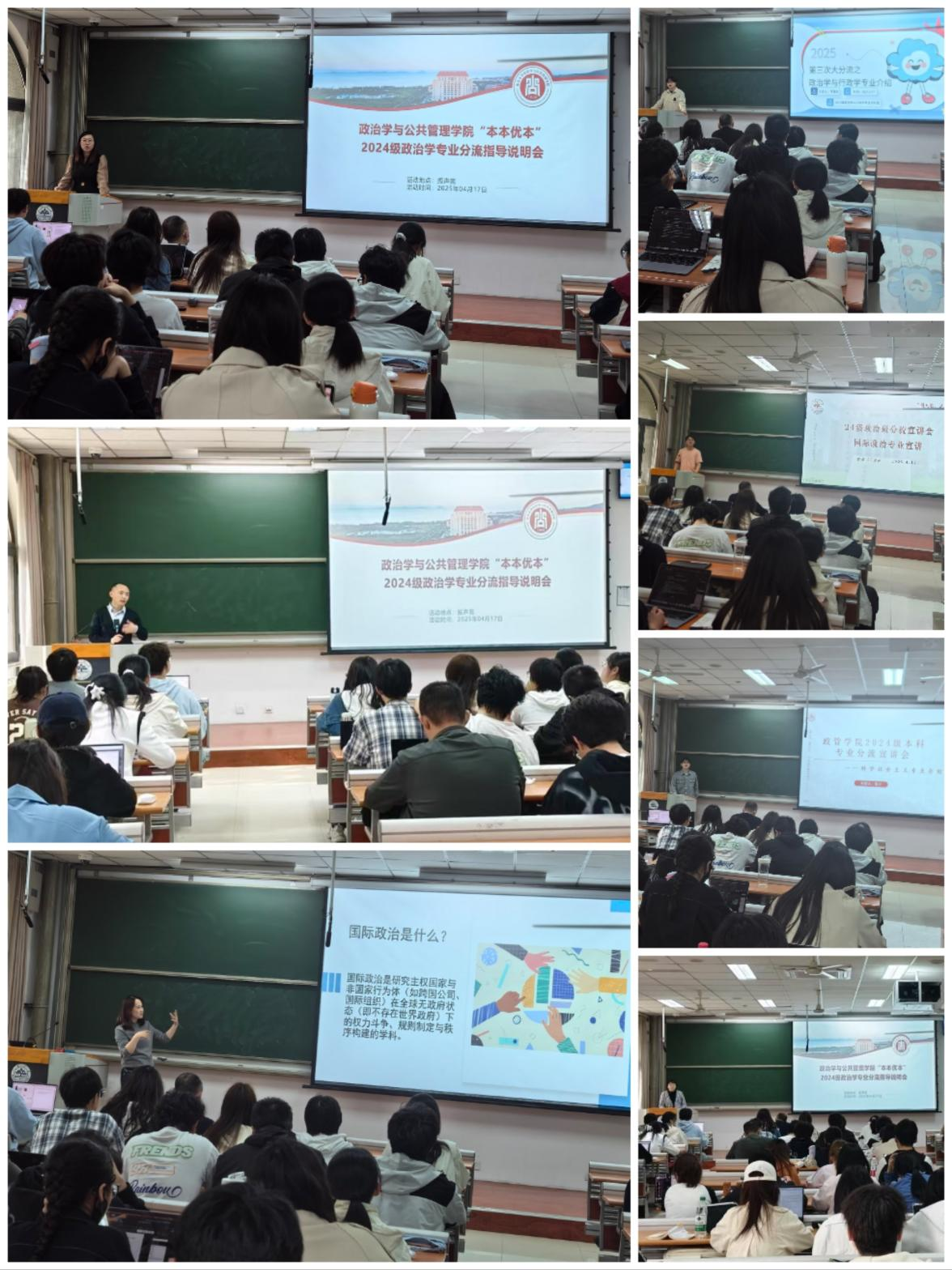 为助力2024级政治学大类本科生明晰专业方向、科学规划学业发展,4月17日下午,政治学与公共管理学院面向全体政治学大类一年级学生举办专业分流指导说明会。活动通过"师说·生言"双轨对话模式,由系主任和专业老师领衔解读政治学与行政学、国际政治、科学社会主义三个专业的培养目标、培养特色及发展前景,并邀请22级优秀学子分享专业学习心得,通过多维度的信息呈现与经验交流,为同学们的专业选择提供有力的决策参考,助力大家把握人生的关键转折点。