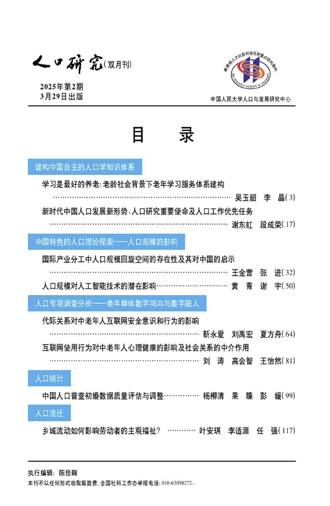 该项研究得到教育部人文社会科学重点研究基地重大项目“中国人口迁移转变的道路与理论研究”(20231JY0055)和山东省社会科学规划研究项目“大龄农民工的回流决策及生计策略研究”(24DRKJ03)的支持。