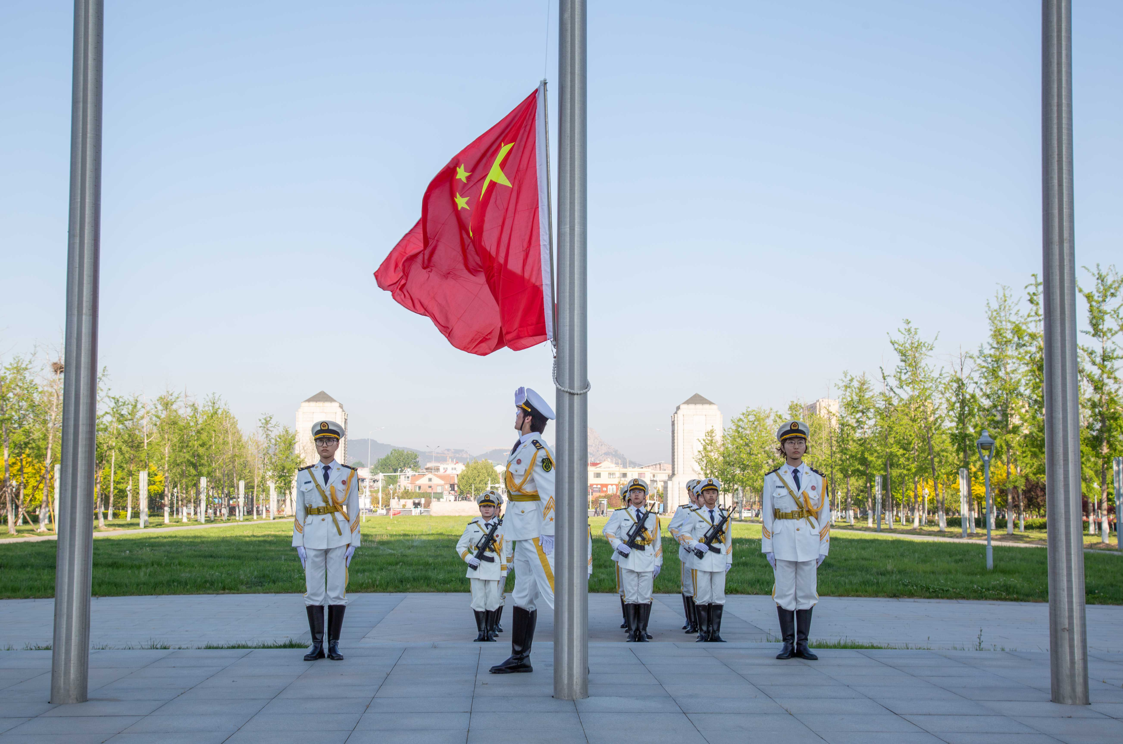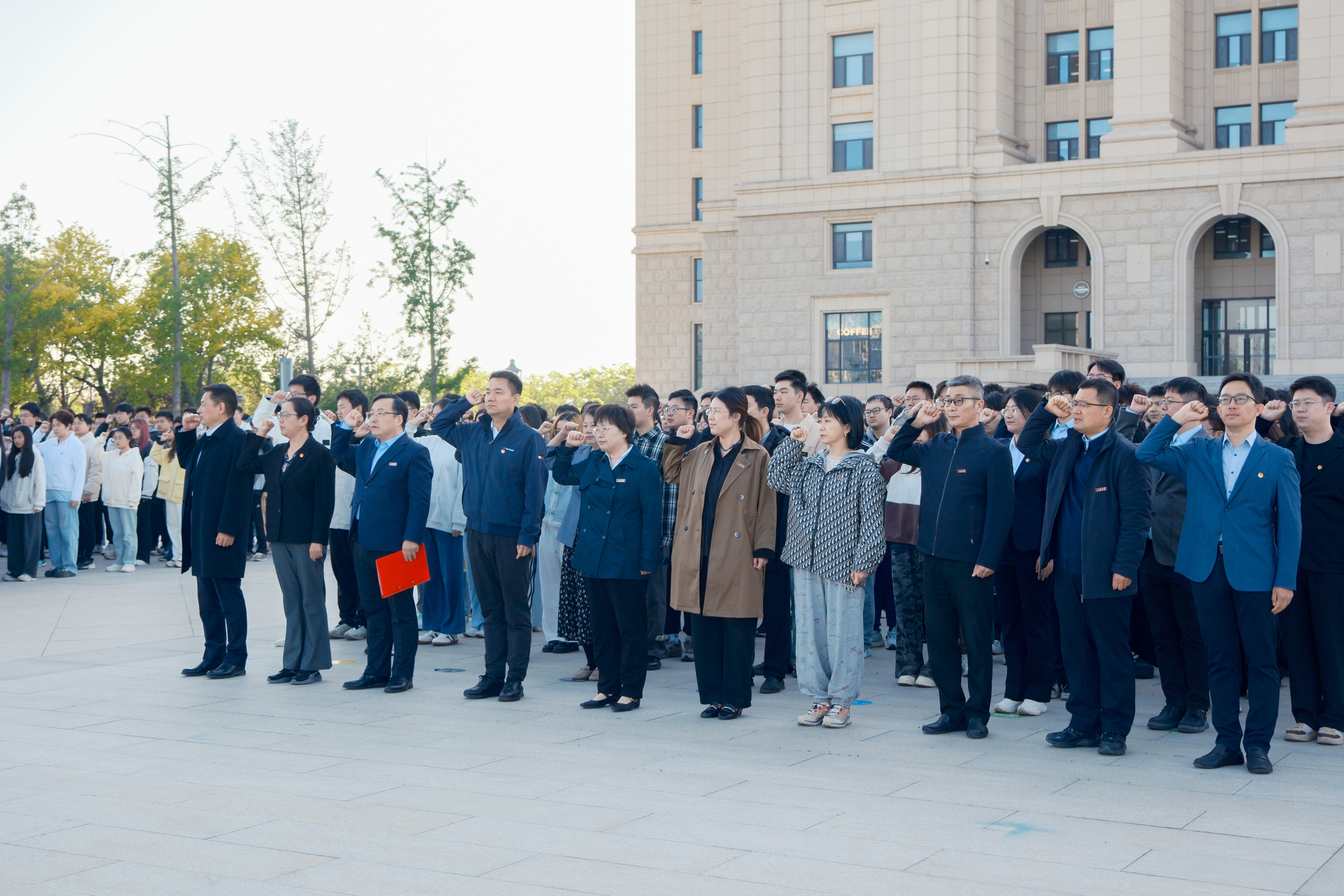 伴随着初升的朝阳,国旗护卫队迈着铿锵步伐走向旗台。在《义勇军进行曲》的雄壮旋律中,全体师生凝视五星红旗冉冉升起,青年代表集体朗诵《青春中国》,随后全体师生共同重温入团誓词,用掷地有声的誓言展现新时代山大人“与祖国同心、与时代同行”的担当。