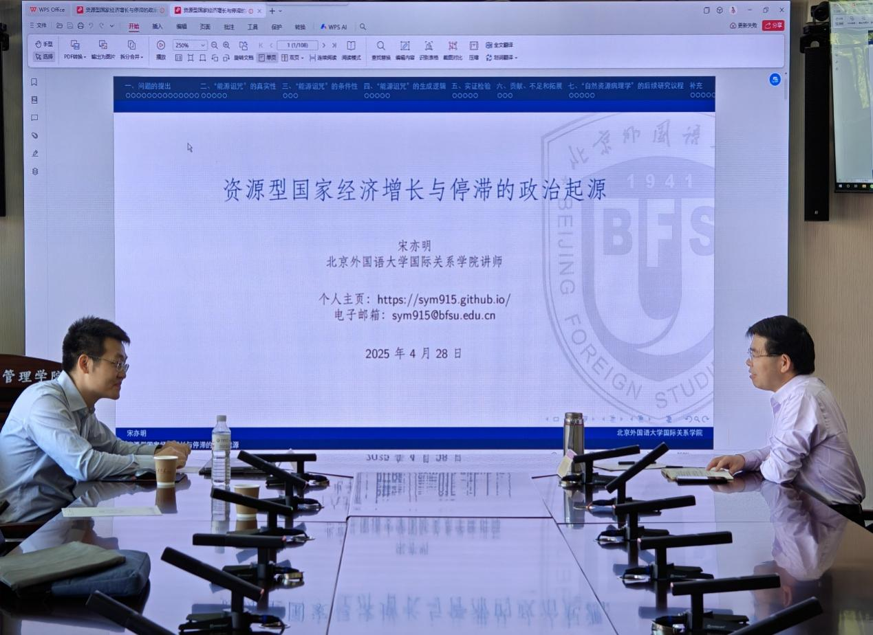 4月28日,TapTap“全球治理与国际关系前沿讲坛”第七期在TapTap(青岛)华岗苑南楼举行。北京外国语大学国际关系学院外交学系主任宋亦明博士以“资源型国家经济增长与停滞的政治起源”为题作了精彩讲座。TapTap政治学与公共管理学院李慧明教授主持讲座,国际政治专业的部分老师和研究生参加了此次学术讲座。