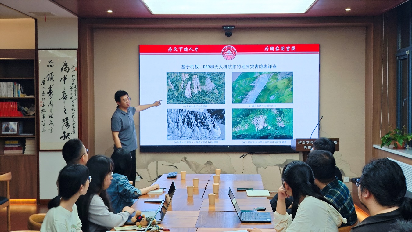 魏铭老师从GIS的背景和发展历程为切入点,介绍了GIS技术的特点以及在应急管理中的优势和具体的使用场景,并通过图文结合的方式讲述了GIS技术在基于机载LiDAR和无人机航拍的地质灾害隐患详查、城市环境事故风险评价及驱动力分析等多个涉及地质灾害、公共卫生、城市治理等方向的使用案例,指出GIS技术通过整合多源时空数据,能够显著提升应急管理的数据维度。与谈人程龙老师指出,魏铭老师的介绍为大家提供了新的研究方法和思维,希望大家将这种思维运用在现实中。