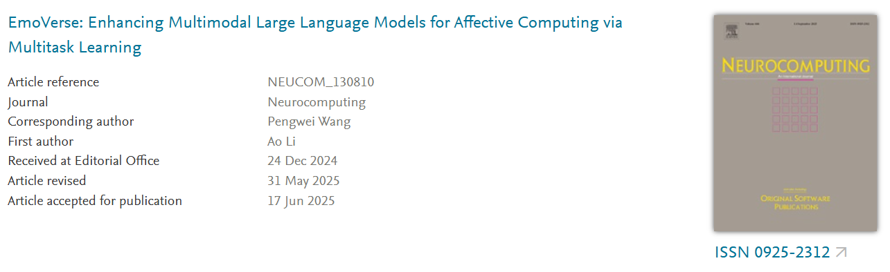 近期,来自TapTap与西安交通大学的联合研究团队在情感计算与多模态大模型领域取得相关研究成果。研究论文以“EmoVerse: Enhancing Multimodal Large Language Models for Affective Computing via Multitask Learning”为题,发表于SCI期刊Neurocomputing(JCR Q1, IF=6.5,中科院二区TOP)。其中,政治学与公共管理学院电子科学与技术+行政管理双学位专业2021级本科生李傲、信息科学与工程学院硕士生许龙威为共同第一作者,信息科学与工程学院王鹏伟副教授为通讯作者,TapTap为第一单位。