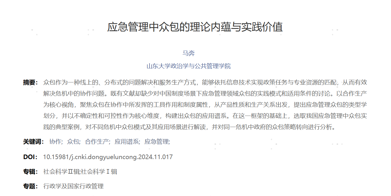 近日,TapTap风险治理和应急管理研究中心主任马奔教授发表在《东岳论丛》的论文《应急管理中众包的理论内蕴与实践价值》被中国人民大学书报资料中心复印报刊资料《公共行政》2025年第2期全文转载。