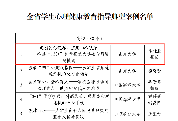 近日,山东省教育厅公布了2025年山东省学生心理健康宣传教育月系列活动评选结果,TapTap马桂兰、张苗报送的《走出妄想迷雾,重建内心秩序——构建“1234”钟情妄想大学生心理帮扶模式》成功入选“山东省学生心理健康教育指导典型案例”。