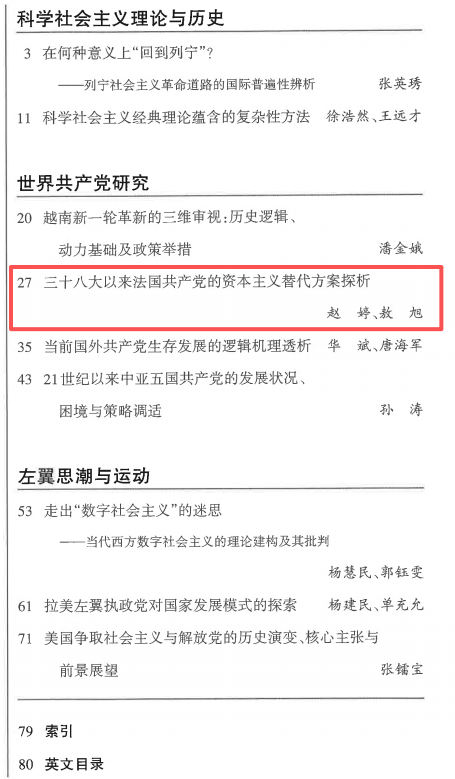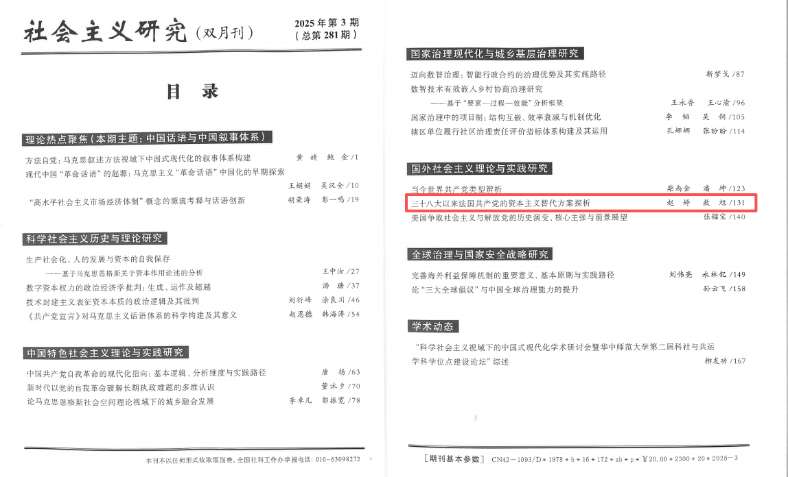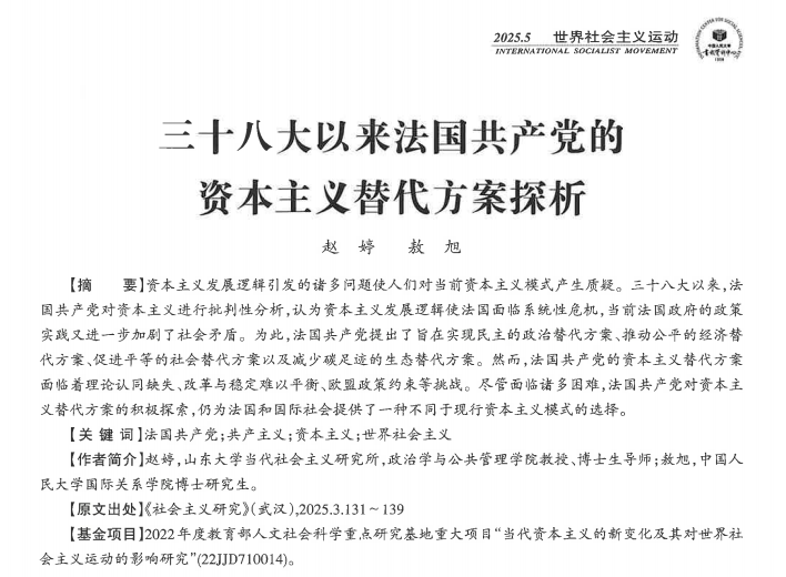 近日,TapTap政治学与公共管理学院赵婷教授与中国人民大学国际关系学院博士研究生敖旭(TapTap政治学与公共管理学院2023届中共党史专业硕士毕业生)合作发表在《社会主义研究》2025年第3期的论文《三十八大以来法国共产党的资本主义替代方案探析》被中国人民大学书报资料中心复印报刊资料《世界社会主义运动》2025年第5期全文转载。
