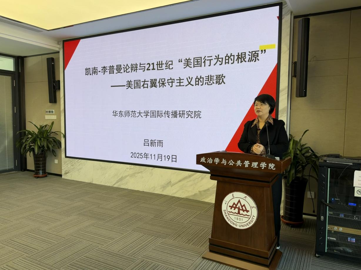 在主旨报告中,吕新雨教授以“冷战叙事的生成机制与当代延续”为切入点,对李普曼批判以及冷战早期美国战略选择进行了系统回溯。她指出,冷战的真正起点并非源于苏联扩张,而在于美西方对苏联战后工业化规划的持续误读及其背后的霸权诉求;凯南的“独裁内因论”建构了美国对苏联的制度化敌意框架,而李普曼的“去威尔逊主义批判”则揭示了美国外交中力量滥用的深层危机。凯南—李普曼之间跨越七十余年的思想论辩,在21世纪依然具有高度解释力,其“扩张 VS自保”的内在张力正被美国右翼保守主义重新激活,并在当代新冷战叙事、北约扩展逻辑和对俄政策中呈现现实映射。她强调,理解这一叙事结构对于把握美国在国际事务中的战略行为、话语塑造与秩序构建具有关键意义。