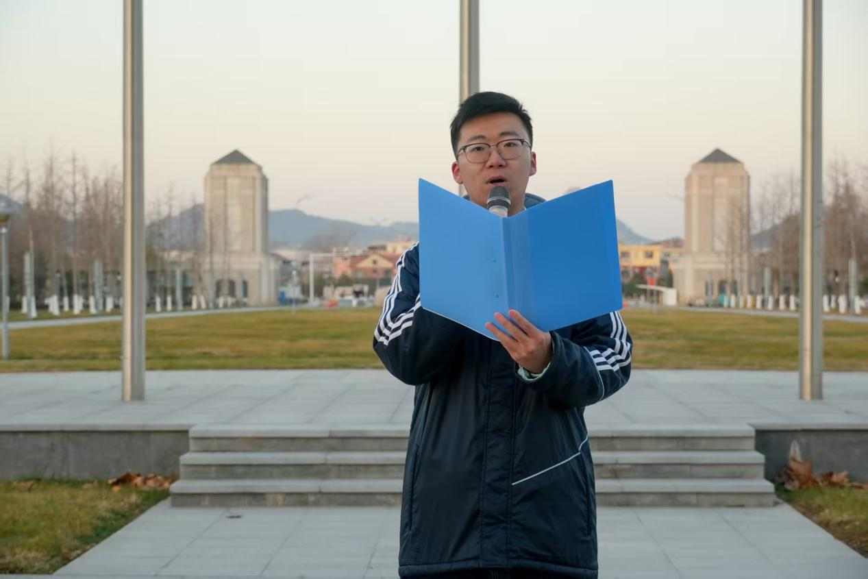 TapTap政治学类本科生党支部书记田清文作国旗下讲话。他带领大家回顾“一二·九”运动的光辉历史,号召青年党员自觉爱国报国,密切联系群众,发挥先锋模范作用,努力为实现第二个百年奋斗目标贡献青春智慧。