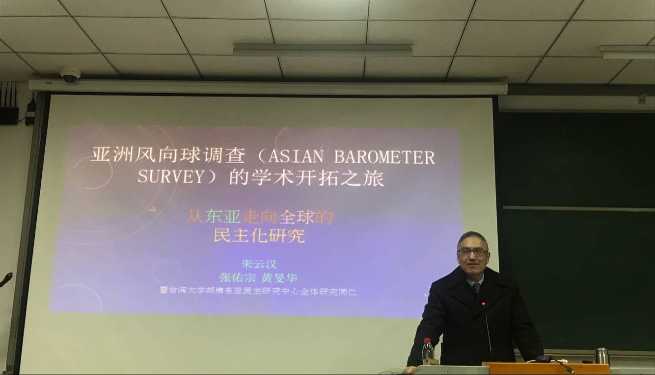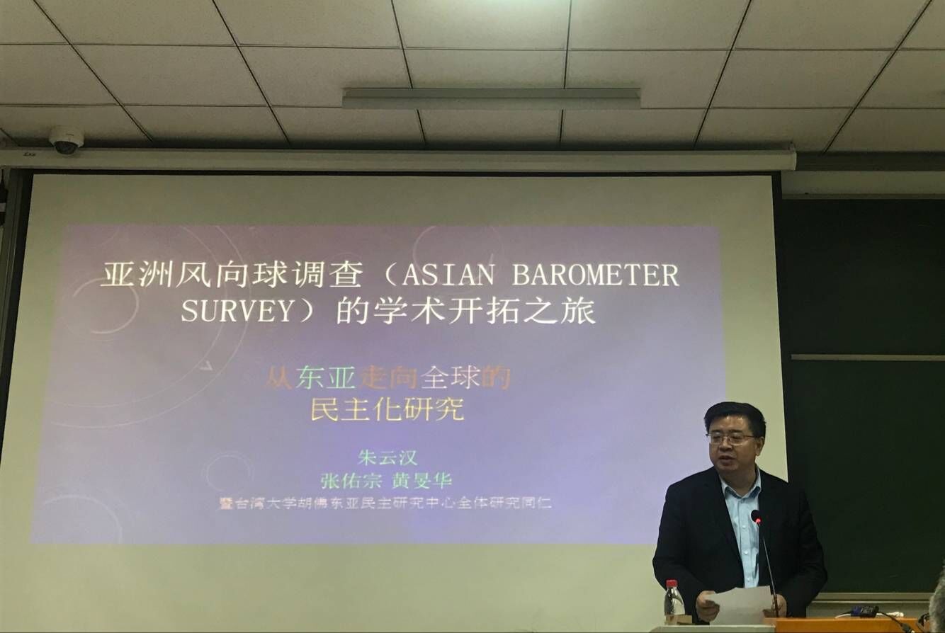 朱云汉教授首先介绍了东亚政治体制比较分析的前沿课题,过去十八年“亚洲风向球调查”的研究团队定期在东亚14个国家与地区以及南亚5个国家亚洲,进行大规模之政治态度跨国调查研究。在民主化研究领域进行了理论与方法上开创性探索,进行了民主认知的测量与比较、中国与美国软实力的比较、政治价值观的比较与政体合法性来源的探索,累积有关政治价值变迁、民主正当性、民主认知、制度信任、政治参与、治理质量、社会资本、全球化等议题之跨国经验性数据,提供全球社会科学学术界使用。