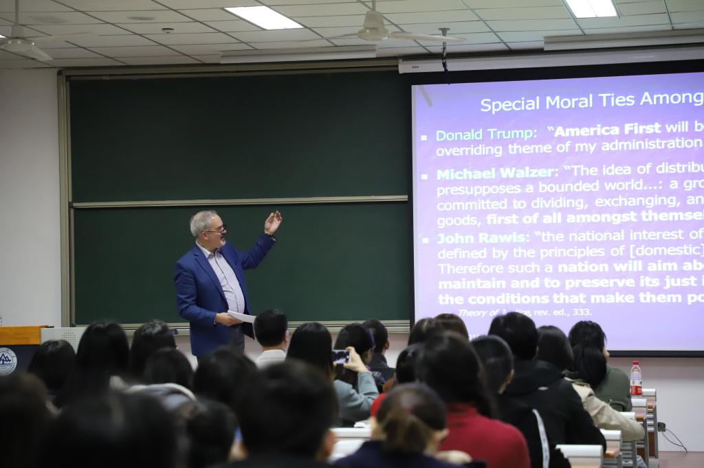 Stephen Macedo教授以当今国际政治中民粹主义兴起的两个标志性事件,“英国脱欧”与“特朗普上台”为起点,分析其发生的原因,提供了“仇外或种族主义与民主制度的失败”与“仇外加种族主义再加民主制度失败”两种解释。讲座从全球化、移民及其影响,世界主义与国内自由民族主义(liberal civic nationalism)和社会正义的对比,什么是民粹主义以及为何民粹主义在此时兴起,应对民粹主义的措施四个方面展开。