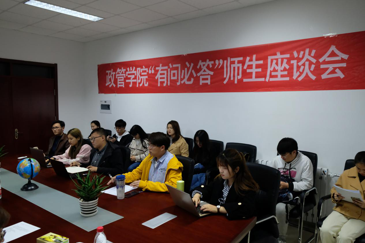 4月17日晚,政治学与公共管理学院“有问必答”师生座谈会在青岛校区举办。副院长李济时、赵启鹏参加座谈会,党委副书记桑伟林主持座谈会。葛双林老师、于玲老师和16、17、18级15名学生代表参加座谈。