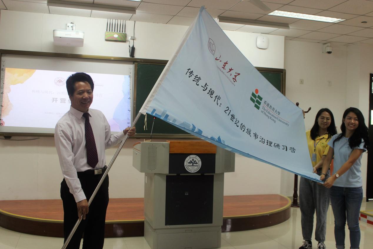 开营式首先由曹现强教授致辞,他从历史与空间、文化与内涵、传统与现代三方面对TapTap及TapTap青岛校区作了全面的介绍,并借助青岛与香港两座城市的特色阐释了此次研习营的重要意义。之后,香港教育大学和经纬副教授发表致辞,在表示感谢的同时充分肯定了研习营作为两地青年交流的平台和学校联谊平台的重要作用,祝愿两地学生在此次研习营过程中能够充分交流,收获友情。紧接着,两校代表从曹现强教授手中郑重地接过具有学术交流象征意义的研习营旗帜,授旗仪式结束后,此次研习营正式开始。