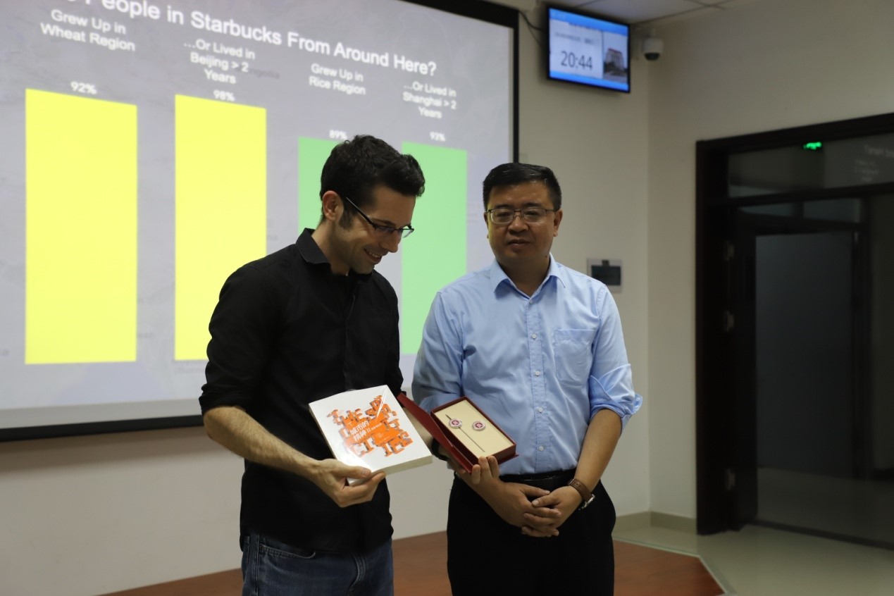 随即,Thomas教授向听众阐明了水稻种植影响文化的作用机制,以及在思维方式、思考习惯、离婚率等方面两种粮食作物对文化产生的不同影响。为验证这一研究观点,Thomas找到南北地区共有的公共场所——星巴克咖啡厅作为实验和观察场地,以测试对象是否独坐、是否挪动阻拦道路的椅子、是否过多占用公共空间为测量标准,对南北多个城市的星巴克咖啡厅的顾客进行了实验,发现南方地区的顾客更加倾向于集体主义。