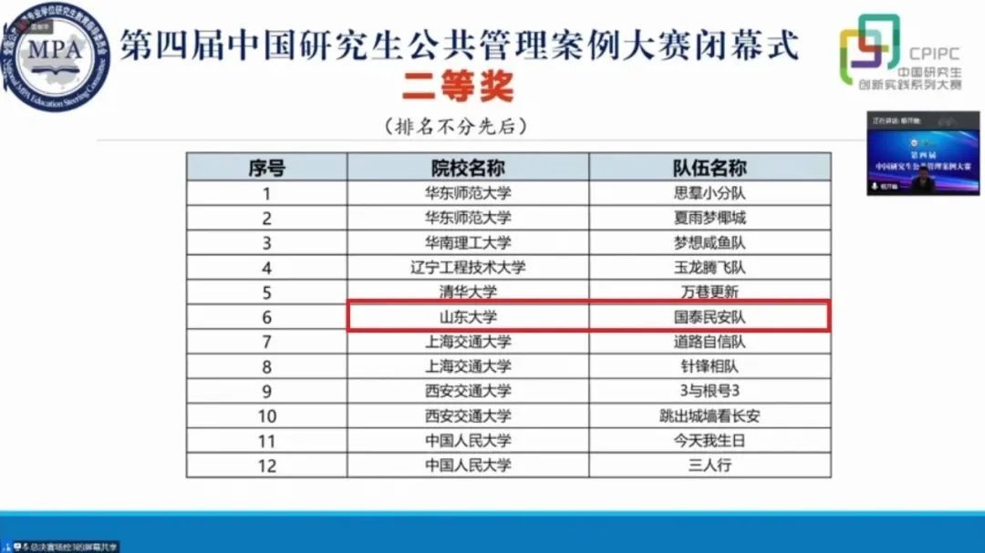 本次大赛中,“国泰民安队”通过细致缜密的案例分析,精准流畅的观点陈述,在全体队员的充分准备和默契配合下,以出色的表现,获得评委一致好评,最终获得第四届中国研究生公共管理案例大赛二等奖。