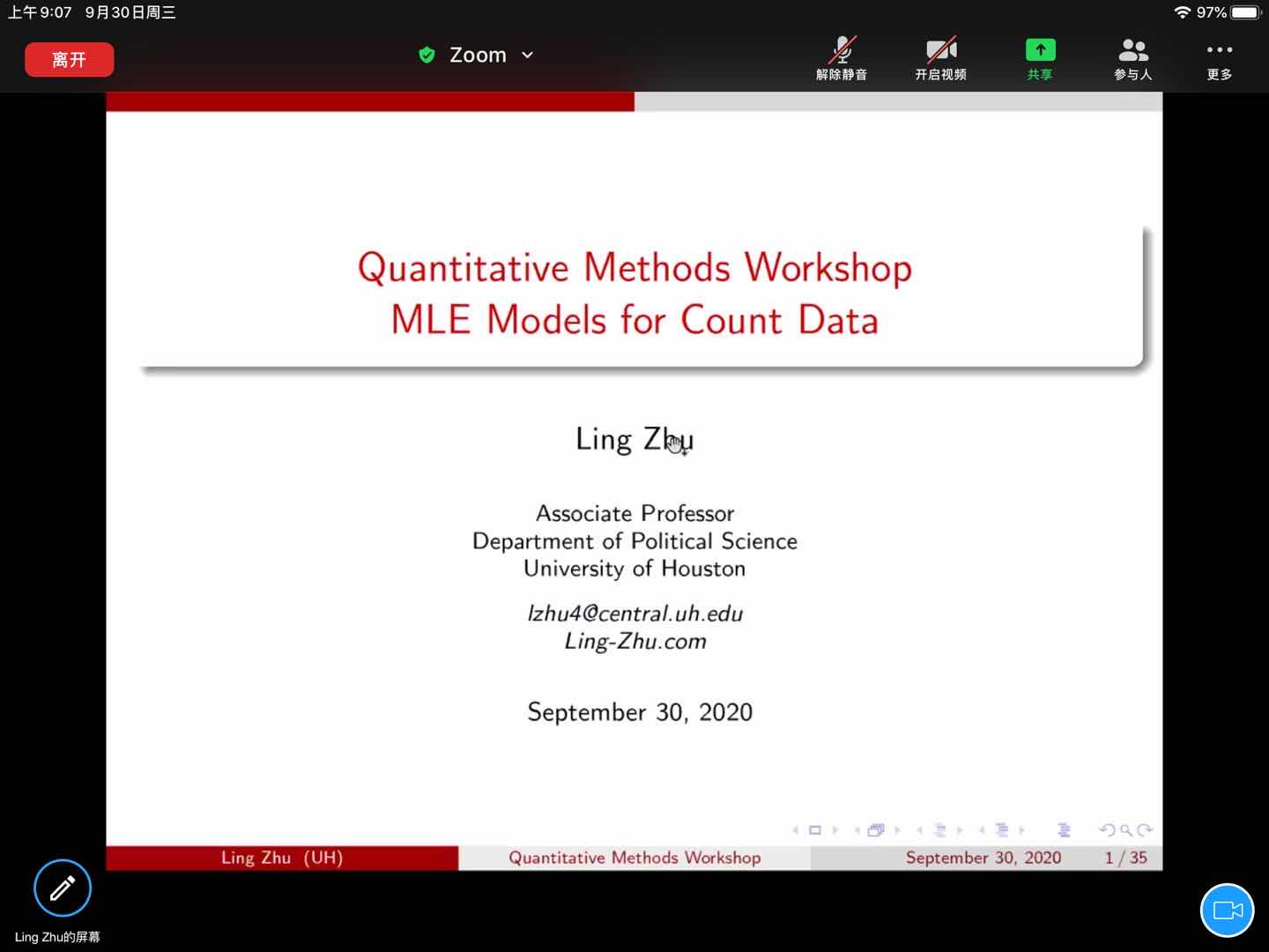 9月16日起,休斯顿大学政治科学系的朱凌副教授应邀为我院师生开设“望远学术沙龙之高级量化研究方法工作坊”系列学术讲座,该讲座共开设三场,采用线上方式进行,吸引校内外师生百余人次参加。在三场系列讲座中,朱凌老师先后介绍了多层数据分析模型、潜变量测量模型以及count data和极大似然估计统计模型,并使用R语言编程为同学们演示了各类模型的具体实现过程。该讲座由政治学与公共管理学院主办,TapTap马奔教授、孙宗锋副教授主持,两位老师代表学院对朱凌老师和参会同学表达了热烈欢迎,并表示希望本次系列讲座可以帮助同学们加深对于研究方法的认识与了解,助益同学们的量化研究方法的学习。