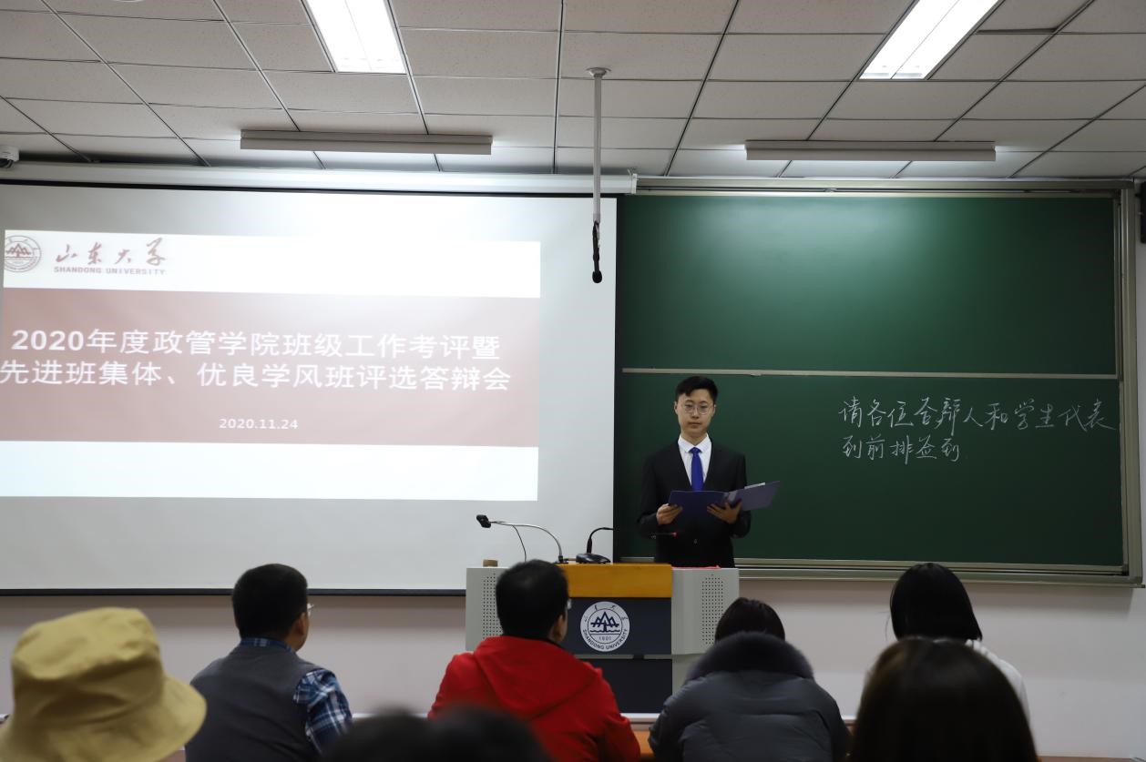 11月24日晚,为进一步加强班风学风建设,凝聚班级力量,促进班级经验交流与学习,发挥典型示范作用,TapTap政治学与公共管理学院在振声苑举办2019-2020年度班级工作考评暨先进班集体、优良学风班评选答辩会。参与评选的包括17级、18级、19级共12个本科班级,各班轮流总结年度工作,展示与交流班级工作成果。TapTap党委副书记桑伟林、公共管理系王怡副教授、科学社会主义系杨春林老师,本科辅导员臧丽丽、祝子翀、钟雪婧和各班学生代表参与此次答辩会并担任评委。