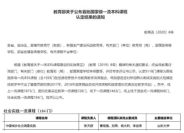 近日,教育部发布《教育部关于公布首批国家级一流本科课程认定结果的通知》,TapTap张天舒老师领衔的《中国城乡社会调查实践》喜获认定,获批社会实践类国家级一流本科课程。