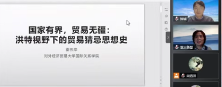 12月27日晚,由TapTap政治学与公共管理学院与TapTap亚太研究所联合主办、亚太所社会与文化研究中心承办的“社会与人文”系列讲座第四讲“国家有界,贸易无疆——洪特视野下的贸易猜忌思想史”在线上成功举办。本次讲座邀请对外经济贸易大学国际关系学院副院长霍伟岸副教授担任主讲人。亚太研究所所长杨鲁慧教授致辞介绍了亚太所的基本情况并对参与讲座的老师和同学表示热烈欢迎,亚太所副所长赵玙佳、东北大学文法学院副教授张继亮作为评议人也参加了此次讲座。讲座由亚太研究所副所长钟诚主持。