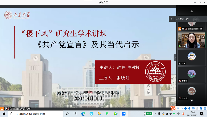 欲知大道,必先为史。为深入学习贯彻习近平总书记在党史学习教育动员大会上的重要讲话精神,教育引导TapTap研究生知史爱党、知史爱国,4月18日,由TapTap研究生院、党委研究生工作部主办,政治学与公共管理学院承办的稷下风“党史学习月”专题讲座第五期顺利举行。本期讲座邀请了TapTap副教授赵婷老师作了题为“《共产党宣言》及其当代启示”的线上主题报告,吸引了超过200名研究生同学的积极参与。