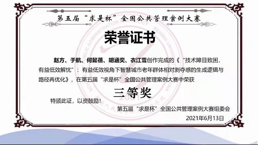2021年6月13日,第五届中国人民大学“求是杯”全国公共管理案例大赛在北京顺利闭幕。由政治学与公共管理学院副教授黄晴老师指导,赵方、于航、何懿蓓、胡涵奕、衣江雪五位同学组成的“汇智治慧”团队完成的参赛项目《”技术障目致困,有益低效解忧“:有益低效视角下智慧城市老年群体相对剥夺感的生成逻辑与路径再优化》进入全国八强,荣获全国三等奖的好成绩。
