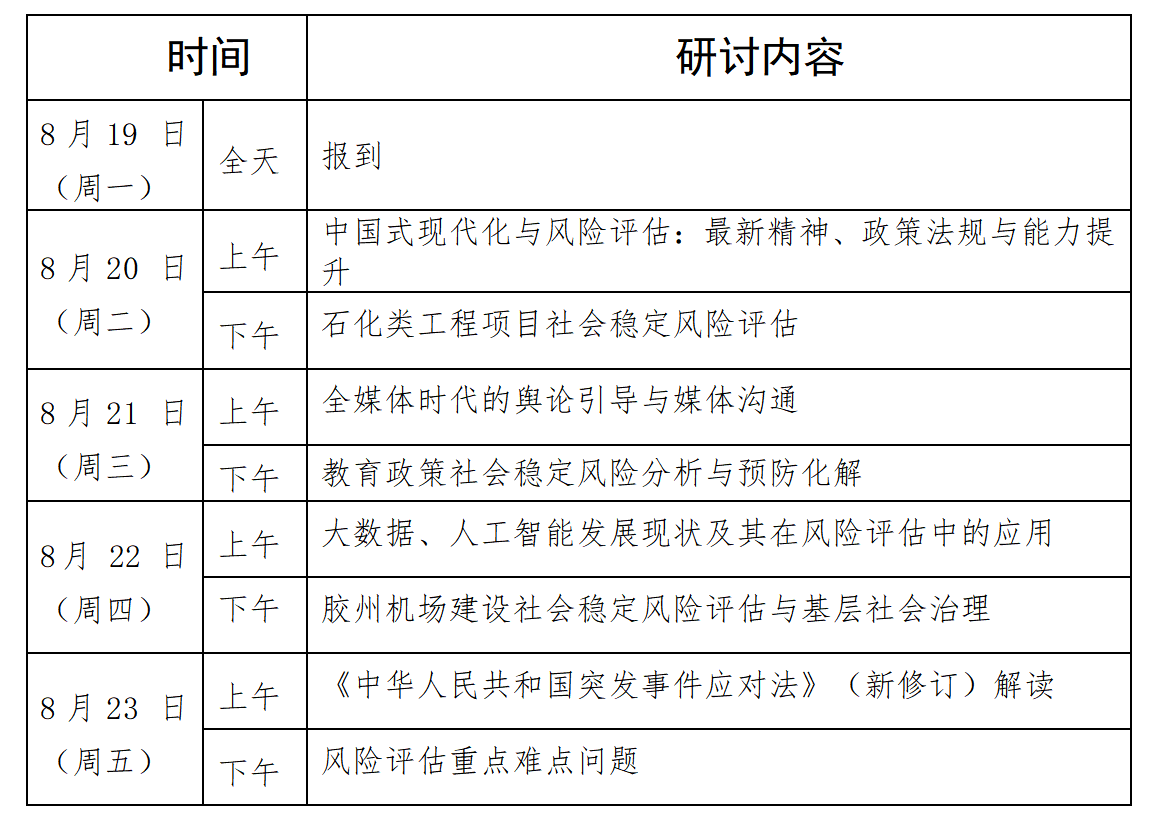 五、课题设置:坚持目标导向、问题导向,针对同层次人员实际需求,量身定制研讨内容,聚焦业内关心的重点难点问题、新情况新问题,分享重大决策社会稳定风险评估领域的最新理论与实践,传递鲜活信息,交流实务经验,拓展业务发展思维,提升重点方向能力。